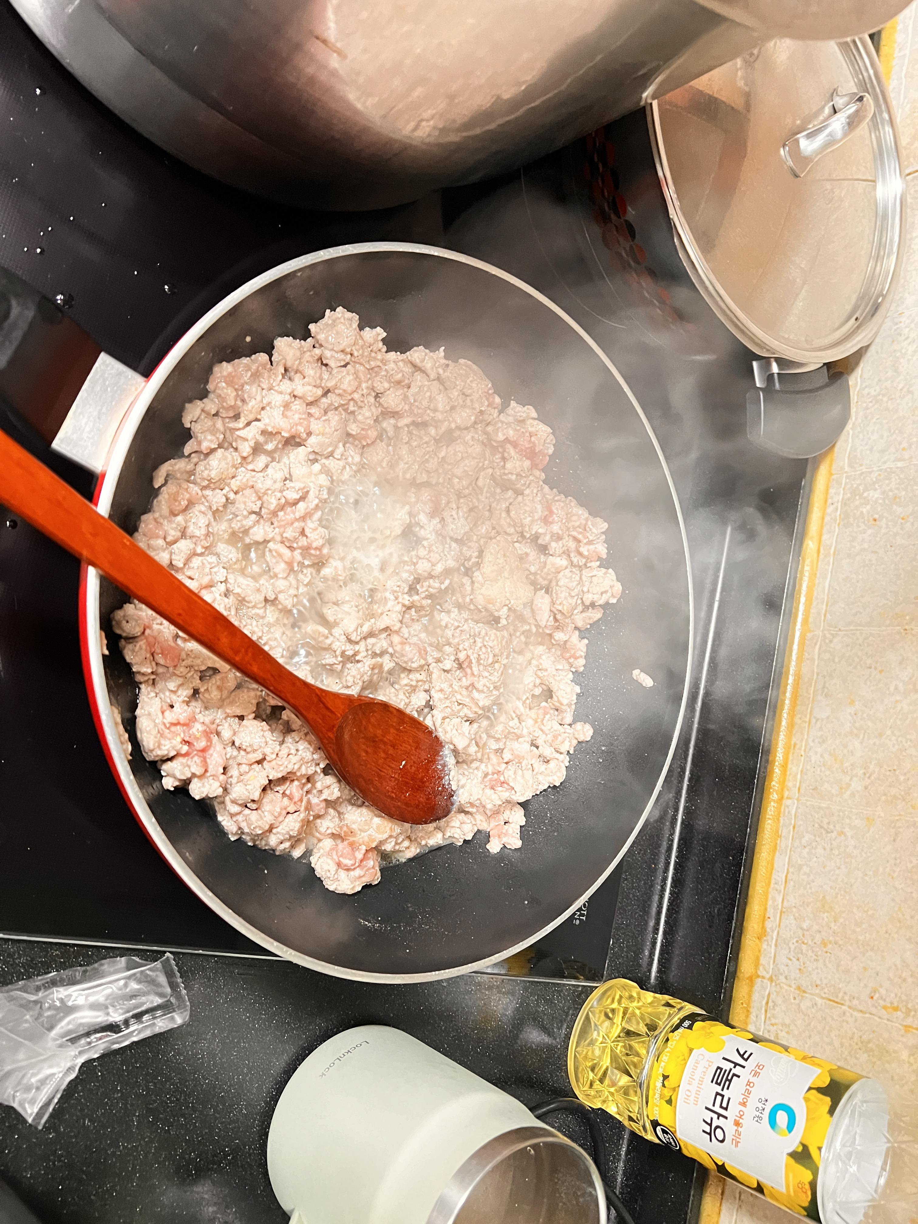 다음으로는 간 돼지고기를 볶습니다.