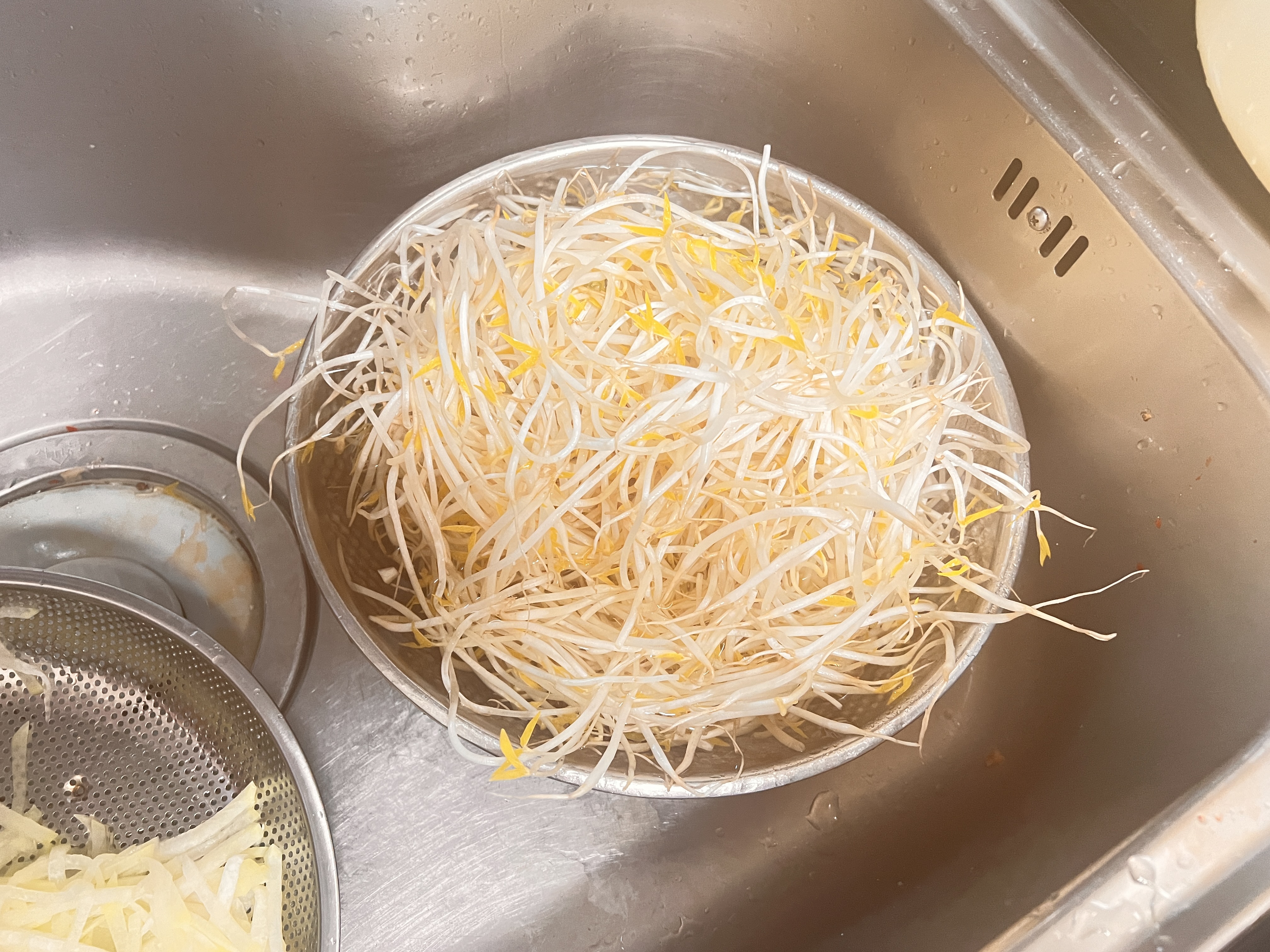 숙주나물도 뜨거운 물에 데쳐서 덜어놓습니다. 남여모두에게 좋은 부추도